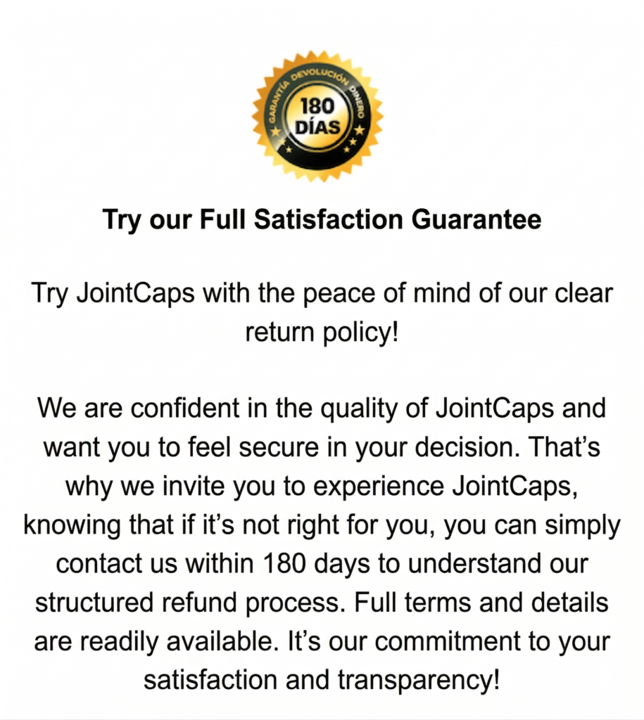 We believe in the effectiveness of JointCaps, but if you’re not completely satisfied, we offer a 180-day money-back guarantee. Simply contact our customer support team and we’ll process your refund — no questions asked